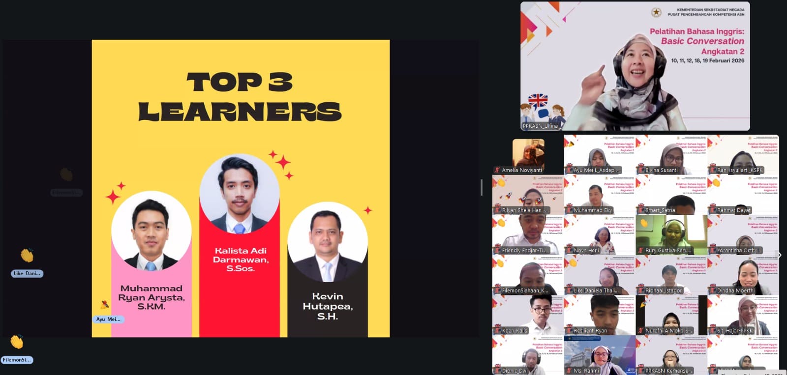 PPKASN Kemensetneg telah menyelenggarakan Pelatihan Bahasa Inggris: Basic Conversation Angkatan 2 secara daring (online) pada tanggal 10 s.d. 19 Februari 2026 melalui media Zoom Cloud