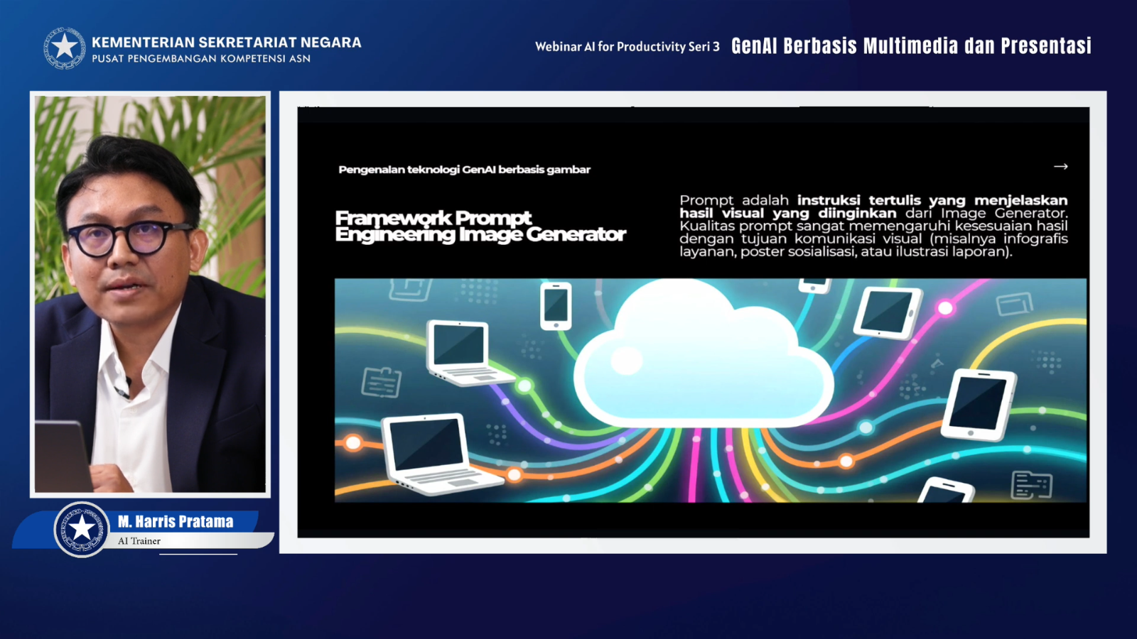 Setelah sukses menyelenggarakan Webinar AI for Productivity Seri 1 dan Seri 2, PPKASN Kemensetneg telah menyelenggarakan Webinar AI for Productivity Seri 3: GenAI Berbasis Multimedia